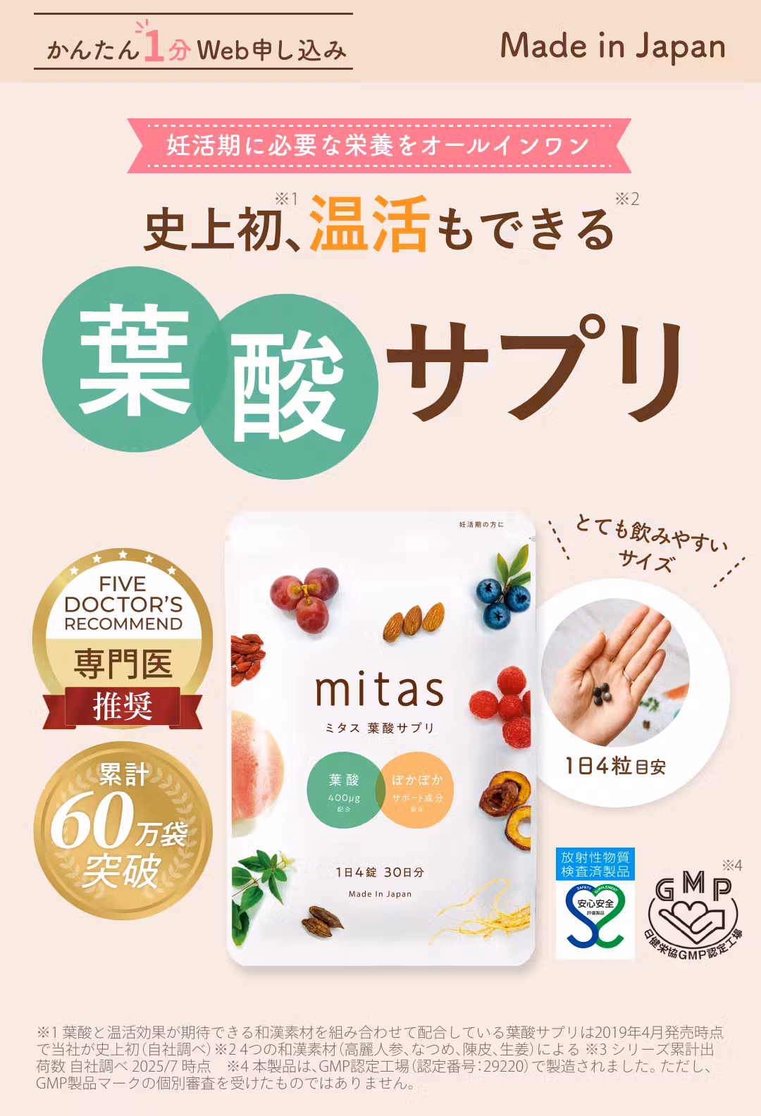 「ミタス(mitas)」は、日々の栄養バランスをサポートしたい方や、食生活だけでは必要な栄養を取りきれるか不安な方に向けてつくられた葉酸サプリです。